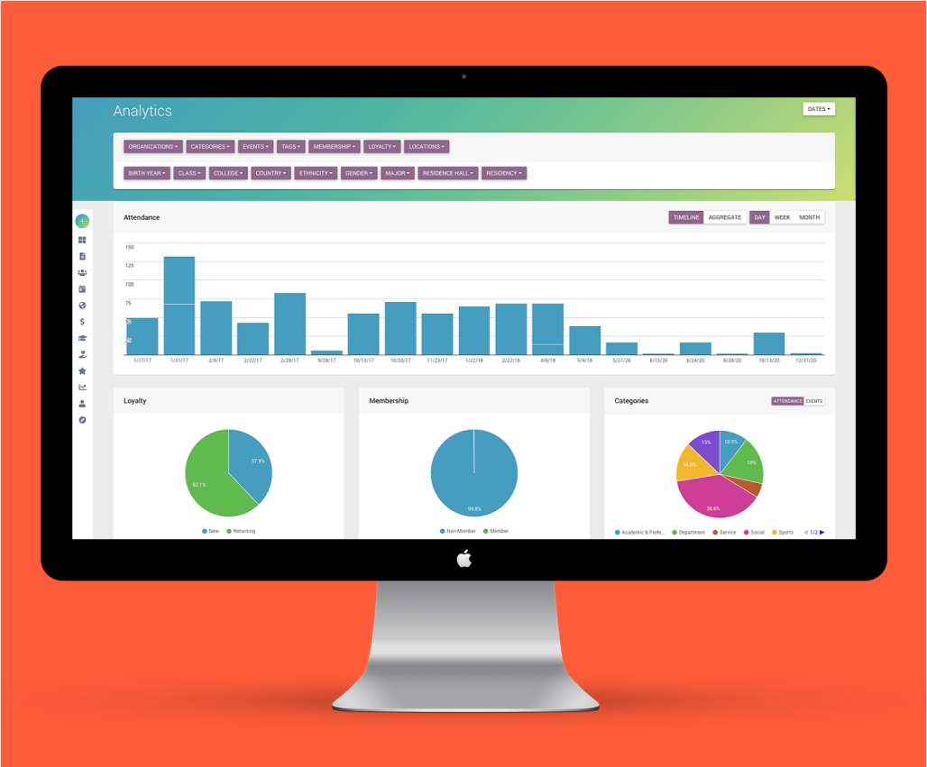 Cross-correlate with categories and tags, loyalty, top locations and organizations, roster membership, and demographic attributes to get a complete picture of campus engagement.